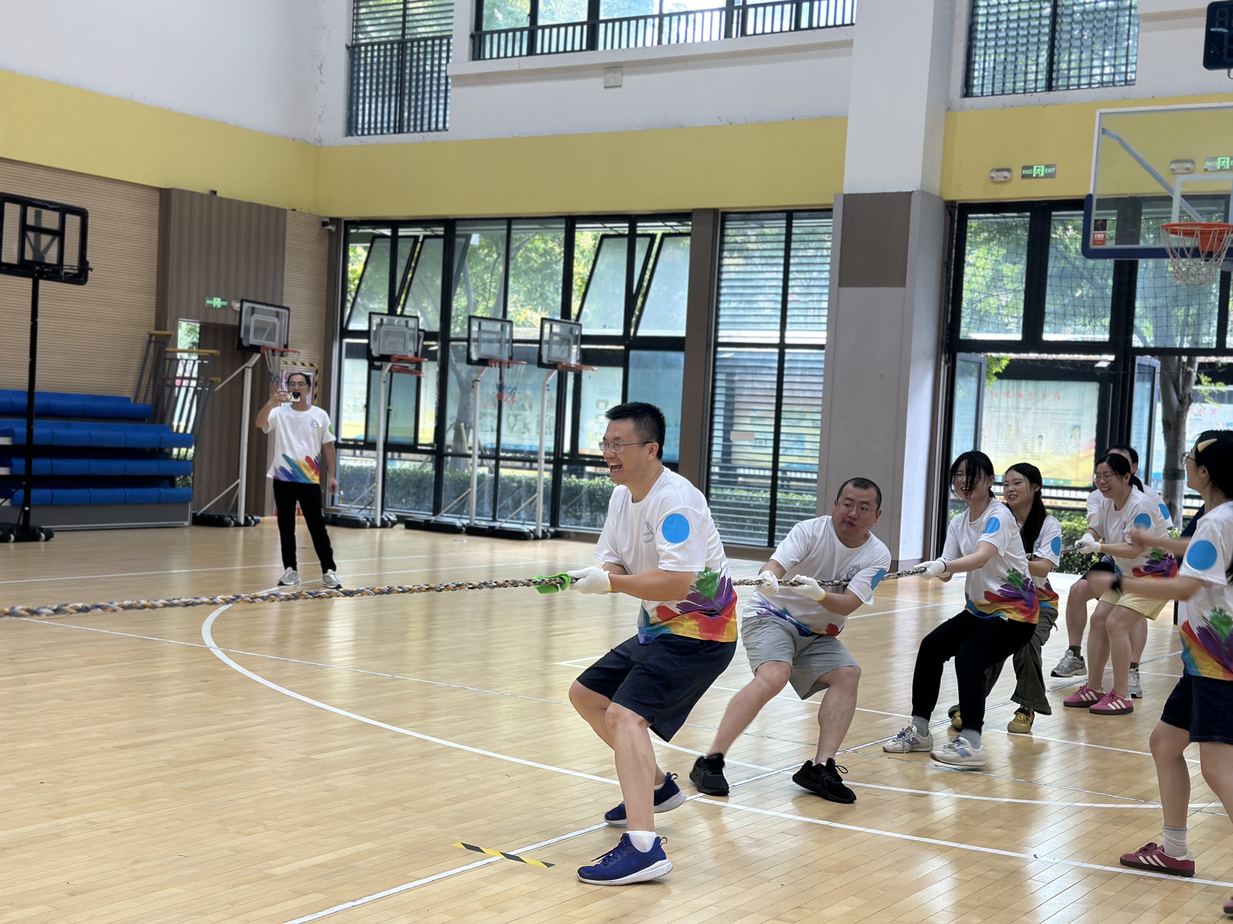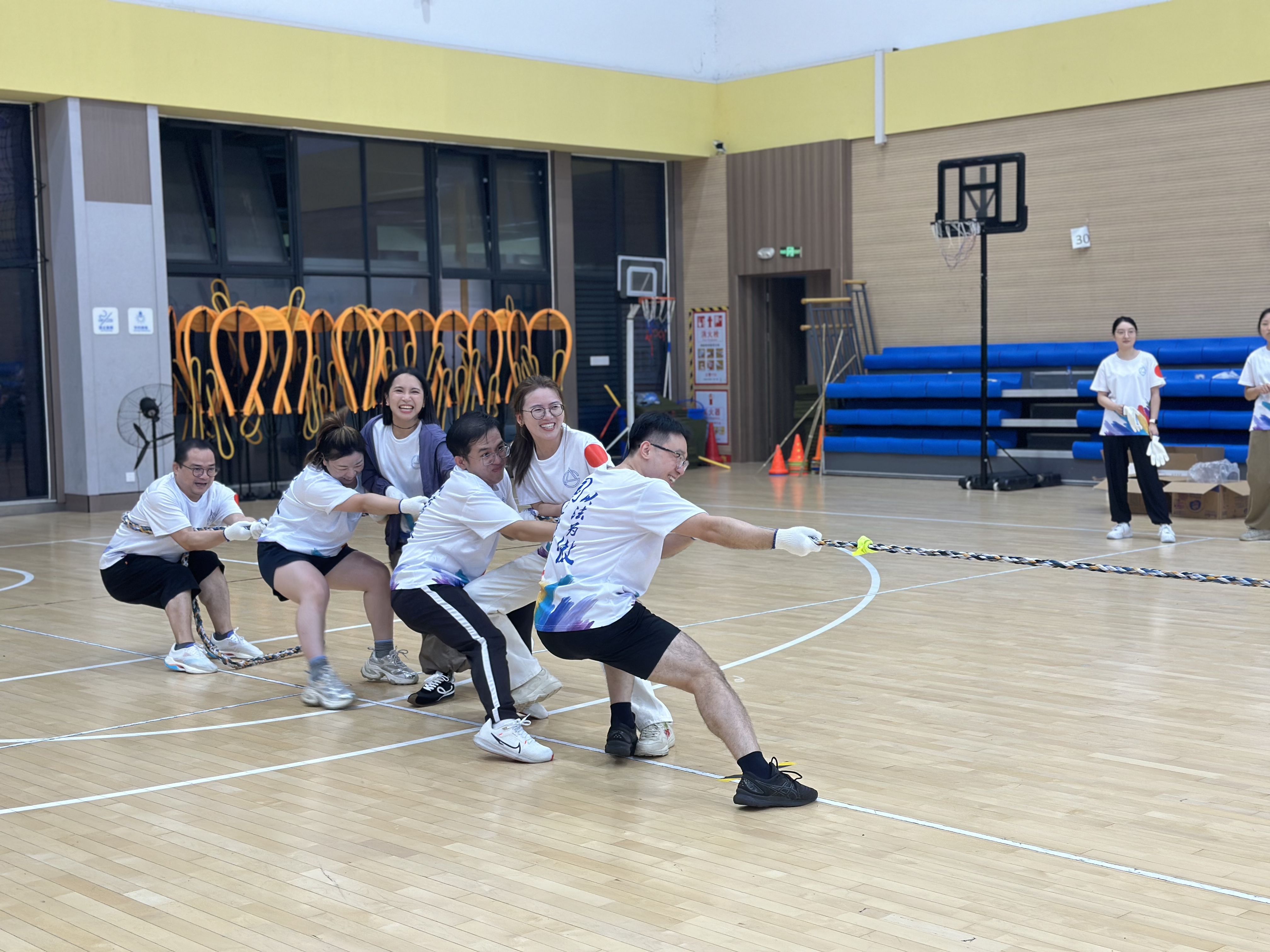 在多向拔河的激烈对抗中,“必胜克队”凭借“稳扎稳打+瞬间发力”的战术,力压群雄,夺得了该项竞赛的第一;而在车轮滚滚环节中,“法槌重击队”则通过“精准分工与节奏把控”,率先冲线,赢得了观众的阵阵欢呼。多人跳大绳项目中,“深藏blue队”与“重在参与队”以无缝衔接的团队配合,展现出了令人惊叹的默契,仿佛是一个整体在翩翩起舞;定点投篮的精准较量中,“必胜克队”再次发力,各队员投球时的专注眼神和传球时的节奏把控,将竞技智慧与协作精神完美融合,令人赞叹不已。