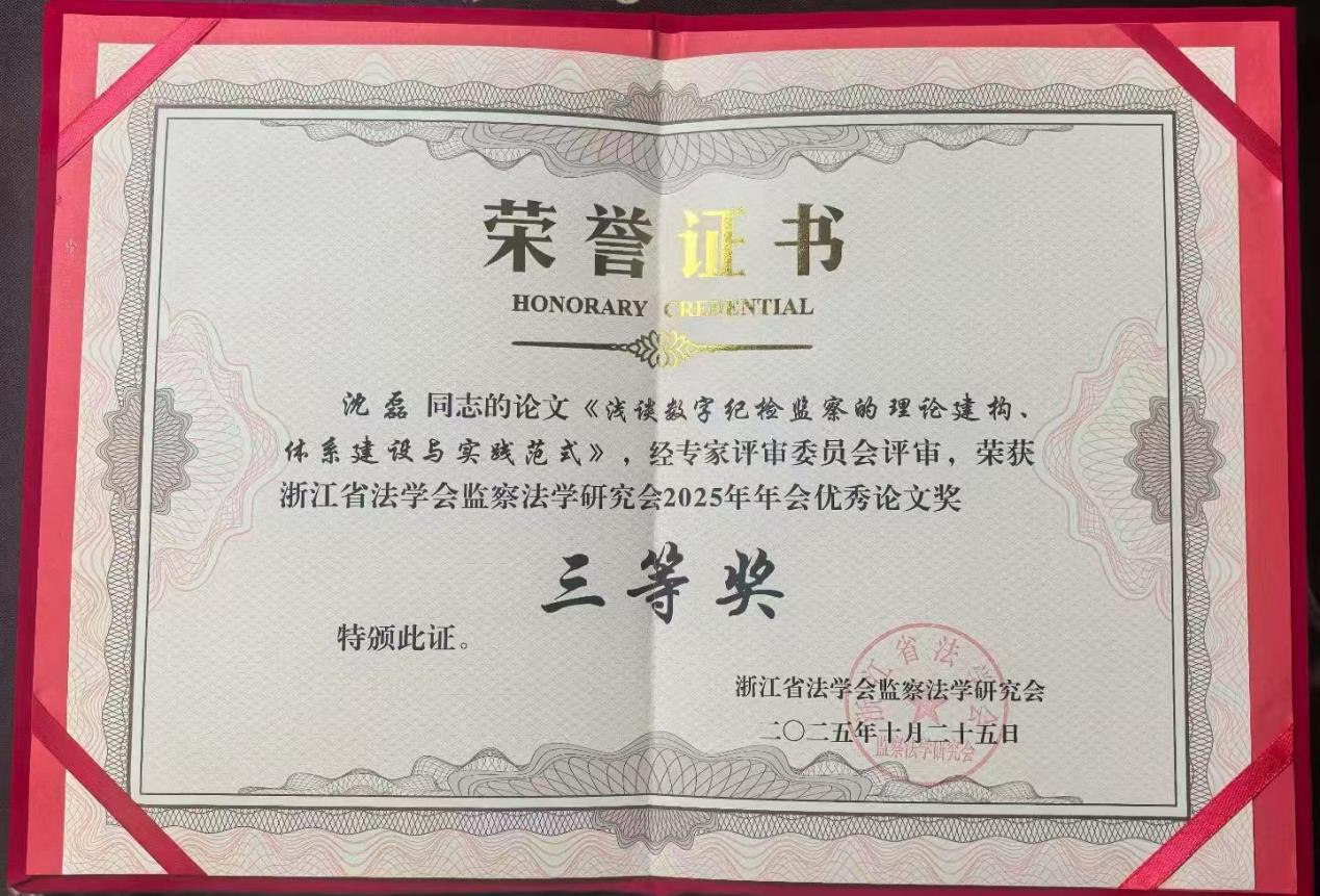 在本次年会闭幕式上,浙江省法学会监察法学研究会秘书长、浙江工商大学法学院教授文姬教授宣布了本次研讨会优秀论文奖、年会优秀论文奖等各类获奖名单。其中,我所示范区分所沈磊律师撰写的《浅谈数字纪检监察的理论建构、体系建设与实践范式》一文,凭借扎实的理论功底、鲜明的实践导向,荣获征文三等奖。