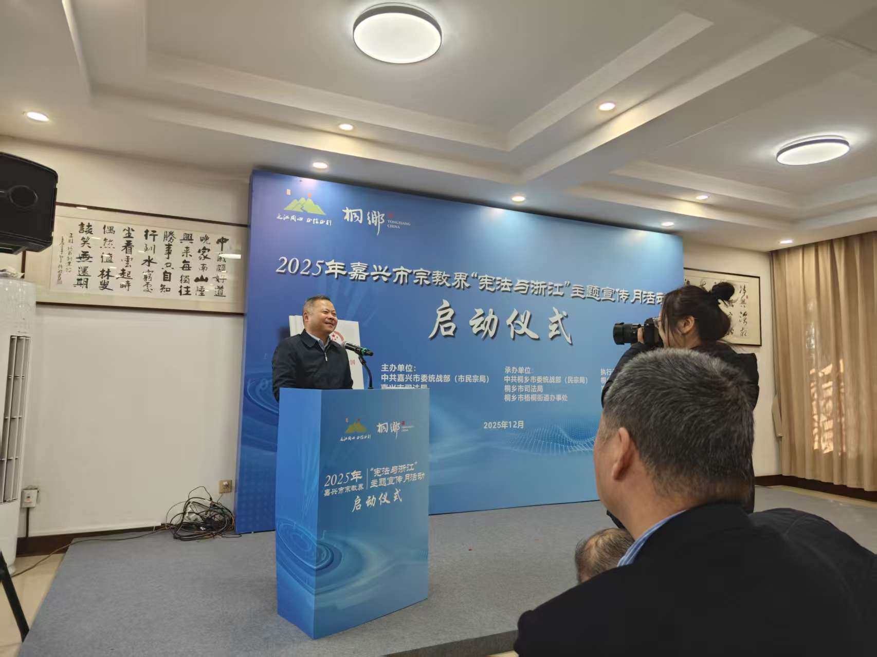 在2025年第十二个国家宪法日来临之际,我所刘焕明律师应邀参加由中共嘉兴市委统战部(市民宗局)和嘉兴市司法局联合主办的嘉兴市宗教界“宪法与浙江”主题宣传月活动,本次活动于12月4日在桐乡凤鸣寺正式启动。本次活动旨在深入学习宣传宪法,增强宗教界人士和信教群众的法治观念,将宪法精神融入宗教活动,引导信教群众尊法学法守法用法,吸引了各界人士积极参与。