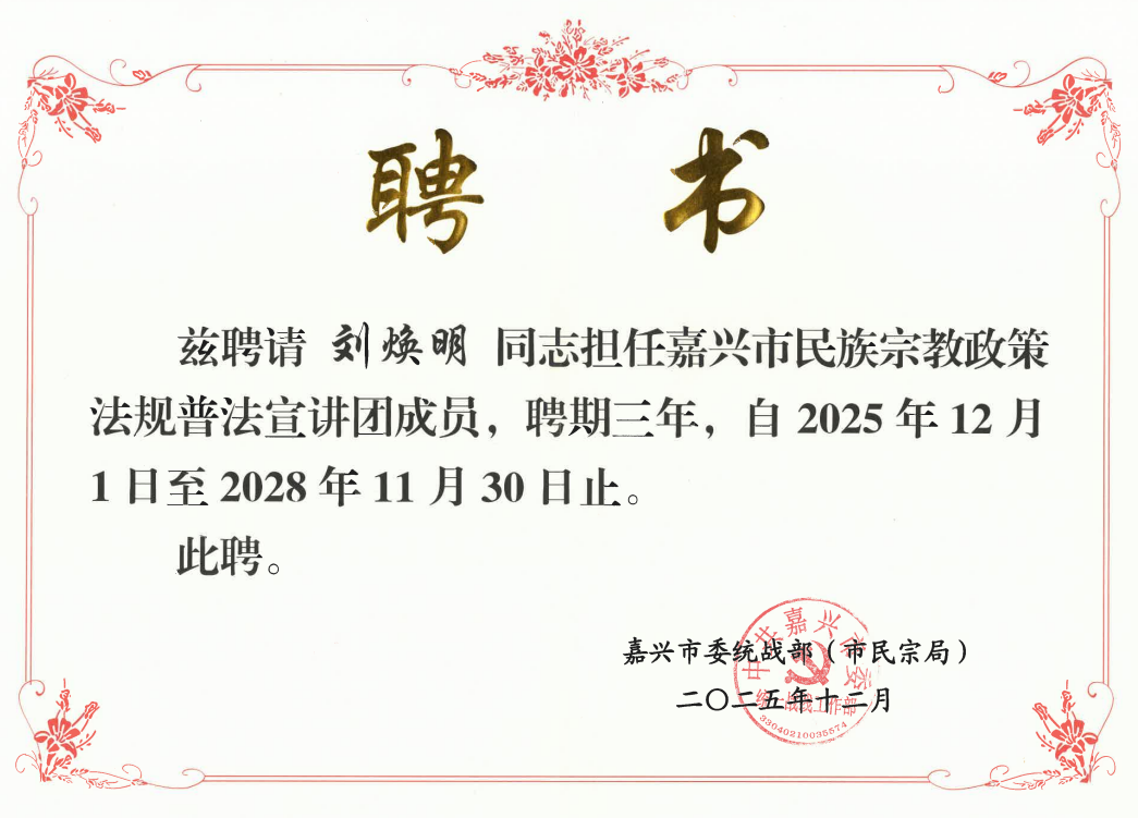 为提升普法工作的专业性和实效性,主办方领导向浙江国傲律师事务所刘焕明律师等宣讲团成员颁发了聘书,正式聘任其为“嘉兴市民族宗教政策法规普法宣讲团”成员。刘焕明律师在民商法、宗教法等领域拥有丰富经验,此次受聘后,将依托自身专业优势,积极参与民族宗教政策法规的宣传解读工作,助力宗教界依法开展活动、为全市宗教场所提供权威、专业的法律咨询,为宗教事务管理提供坚实的法治保障。