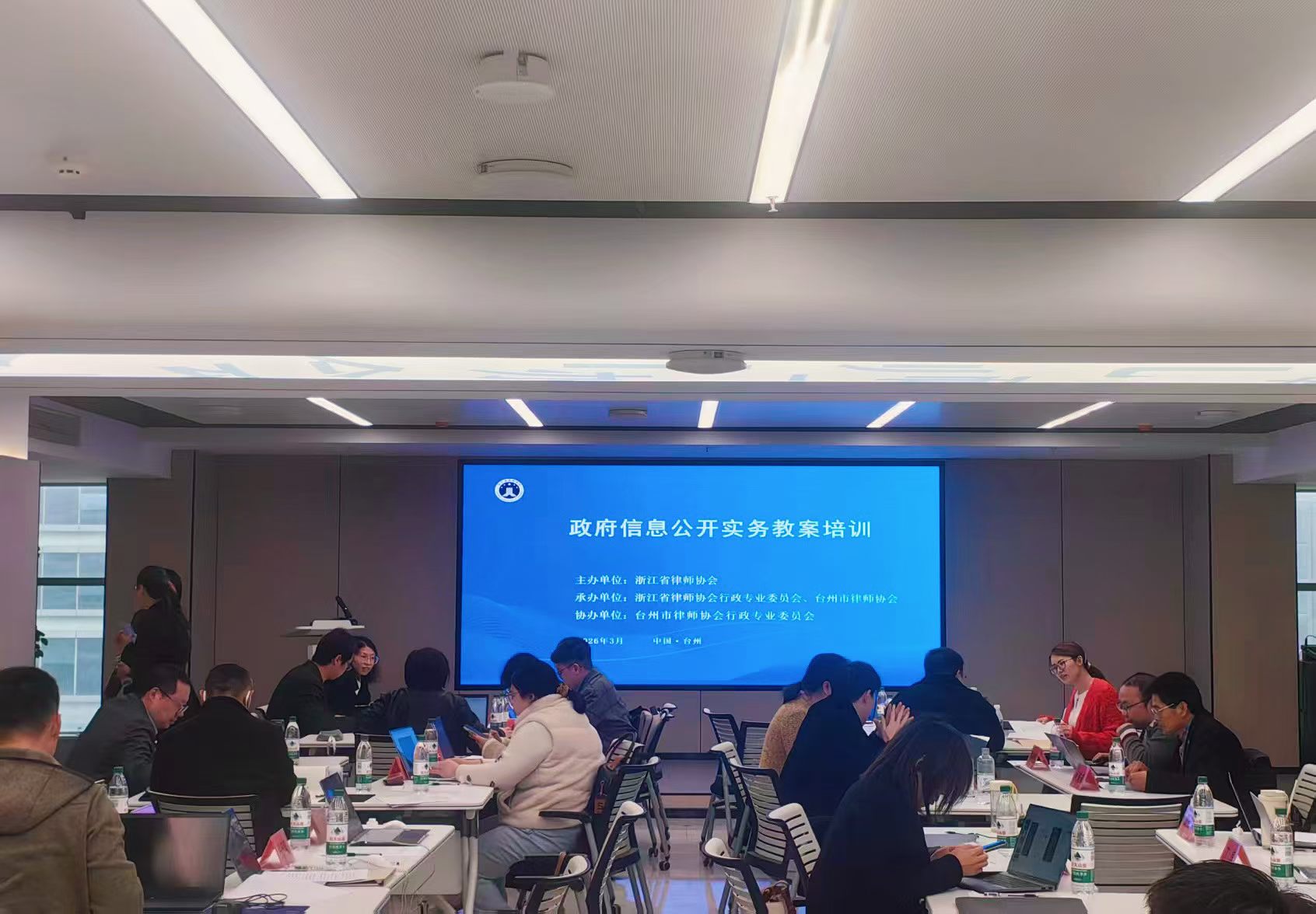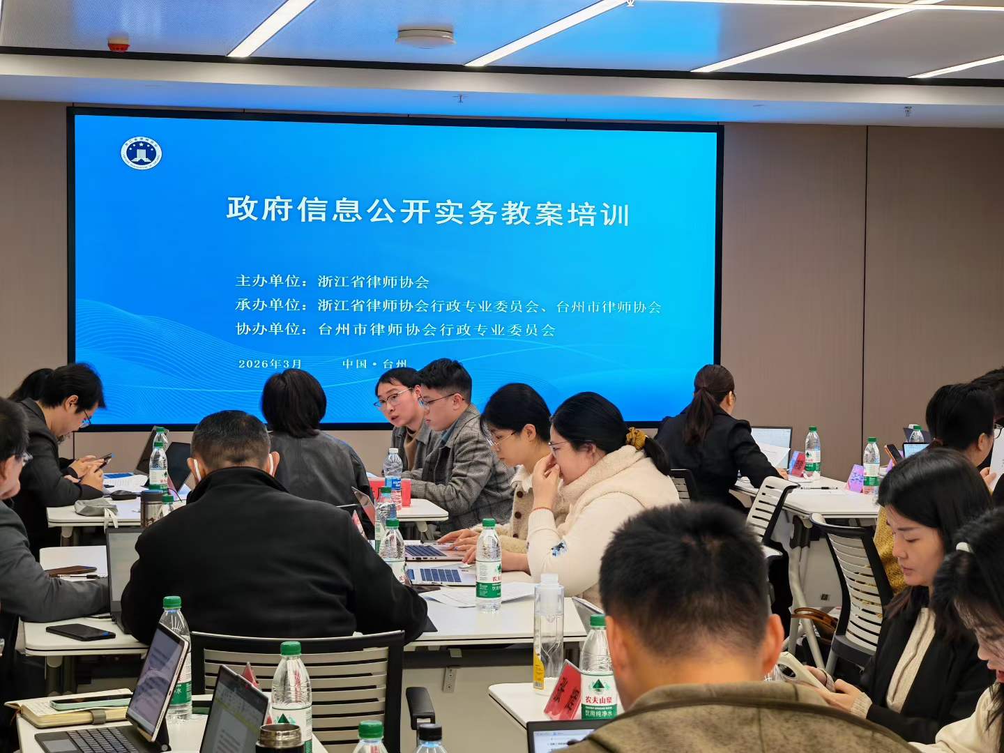 2026年3月29日,由浙江省律师协会主办,省律协行政专业委员会、台州市律师协会承办,台州市律师协会行政专业委员会协办的“政府信息公开实务教案培训活动”在台州顺利举办。我所总分所政府法律服务团队骨干成员韩宇骋、杨蓓佳、张博竣、吕佳敏四位律师参加本次培训,与全省同行围绕政府信息公开实务热点展开深度研讨,展现了我所在政府法律服务领域的专业积淀与务实风采。